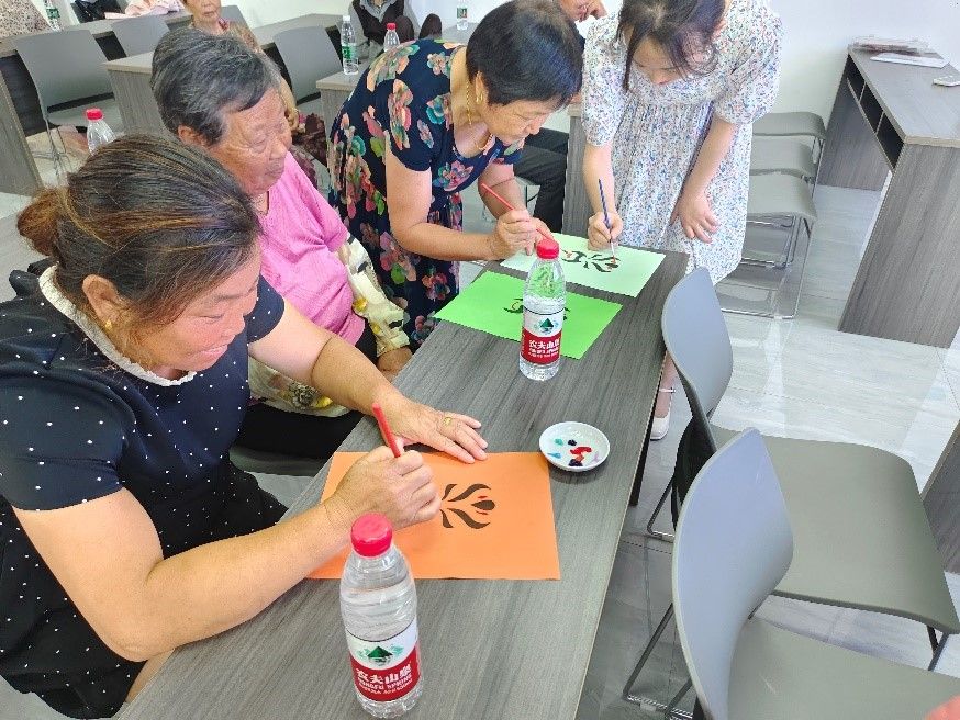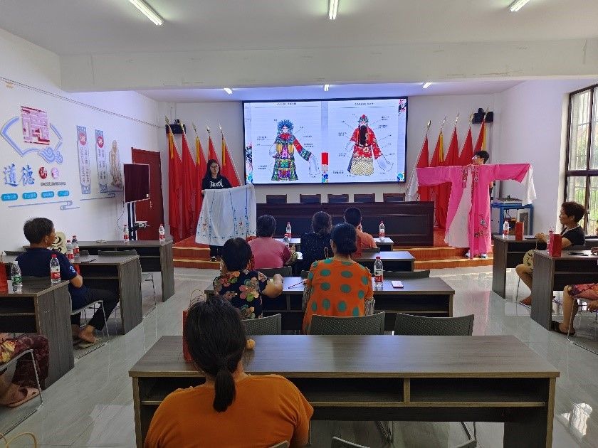 7月13日,团队一行人来到新兴镇永兴村,走进农户,对话农民,弘扬淮剧文化。首先围绕淮剧文化与乡村振兴的主题开展问卷调查,了解淮剧在本土乡村的传播情况。随后组织村民集中观看红色淮剧《送你过江》视频片段,并向村民讲解淮剧戏服,现场手绘淮剧脸谱、发放手绘作品,同时穿插互动问答环节,带领村民共同学习淮剧知识。