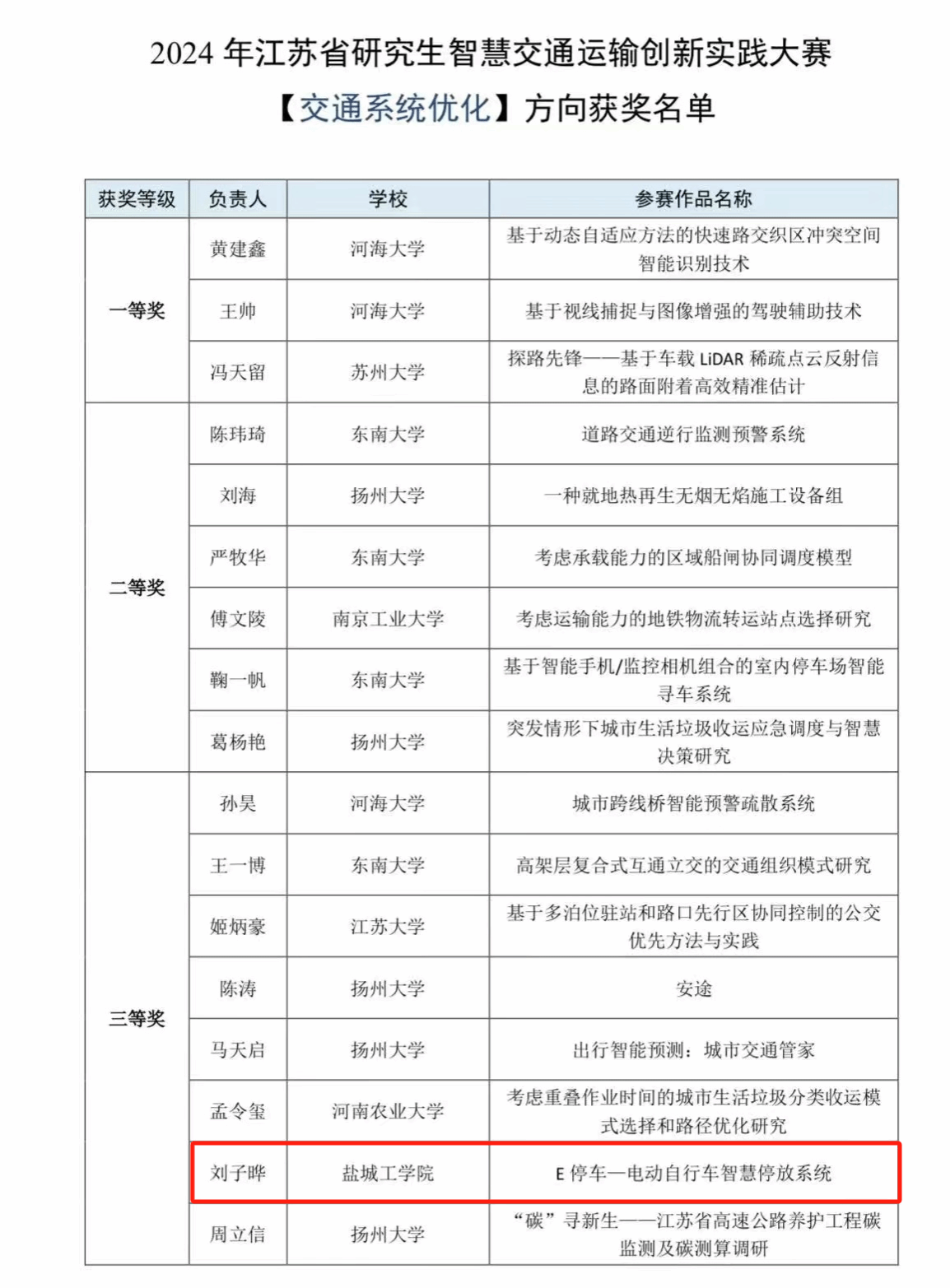 8月18日,2024年智慧低碳交通研究生暑期公司暨江苏省研究生智慧交通运输科研创新实践大赛在东南大学落下帷幕,本次比赛采用线上线下相结合的方式进行。经过线下演讲、线下汇报、现场答辩等环节,在钟栋青和韦凌翔两位教师的指导下,交通运输专业刘子晔、高艳翠、卢艺、左昊、冀俊元五位员工完成的作品《E停车——电动自行车智慧停放系统》获得三等奖。