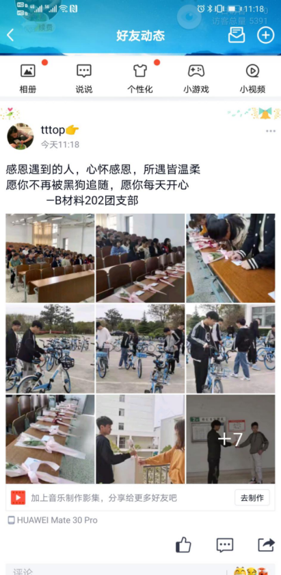 B材料202班的团日活动则是以主题为“心理”,“感恩”的活动为基础,团支部的同学们都从中收获了抑郁相关的病理知识和治疗方法,也从志愿服务中体会到了服务的快乐。送给陌生人一朵玫瑰花,让陌生人感受来自同学们的善意,不仅赠花人打破了社交的冰层,也传递了快乐。花内藏着来自同学们的祝福,一张便签纸承载的是爱。此次团日活动突破了教室的限制,是同学们走出舒适圈的大胆尝试。同时,还组织班级同学在校园内找到乱序的共享单车,大家一起把收整共享单车,还校院一个美丽的新环境。