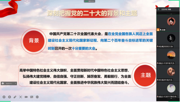 高姗从大会背景主题、“两个结合”、“中心任务”等方面介绍了过去五年的工作和新时代十年的伟大变革、党和国家事业取得的历史性成就以及新时代中国特色社会主义的宏伟蓝图。她强调,取得这些成就最根本的原因在于有习近平总书记作为党中央的核心、全党的核心掌舵领航,在于有习近平新时代中国特色社会主义的思想科学指引,充分证明了中国化时代化马克思主义行。她号召全体同学做马克思主义的鉴定信仰者、积极传播者和模范践行者。
