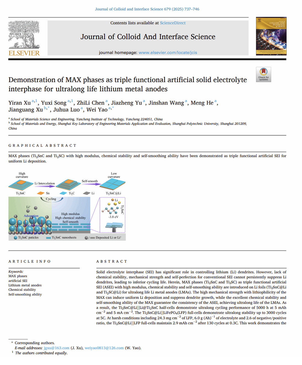 近日,PlayAce游戏平台研究生徐毅然在姚为教授的指导下,在《Journal of Colloid and Interface Science》(中科院一区Top,影响因子:9.4)上以第一作者身份,PlayAce官方网站为第一单位发表了题为“Demonstration of MAX Phases as Triple Functional Artificial Solid Electrolyte Interphase for Ultralong Life Lithium Metal Anodes”的研究论文(J. Colloid Interf. Sci. 2025, 679, 737-746),文章链接:https://doi.org/10.1016/j.jcis.2024.10.019。该论文是公司研究生高质量培养的又一次重要体现。