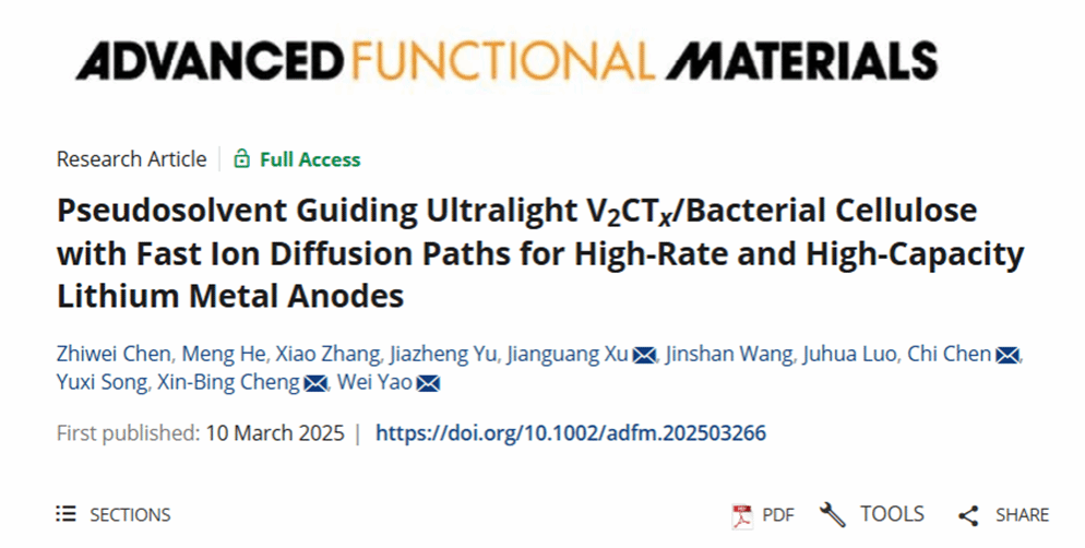 近日,PlayAce游戏平台姚为教授在材料领域顶级期刊Advanced Functional Materials(中科院一区Top,影响因子18.5)上发表题为Pseudosolvent Guiding Ultralight V2CTx/Bacterial Cellulose with Fast Ion Diffusion Paths for High-Rate and High-Capacity Lithium Metal Anodes的研究论文(Adv. Funct. Mater. 2025, 2503266, DOI: 10.1002/adfm.202503266),PlayAce官方网站为第一署名单位,研究生陈志伟为论文第一作者。