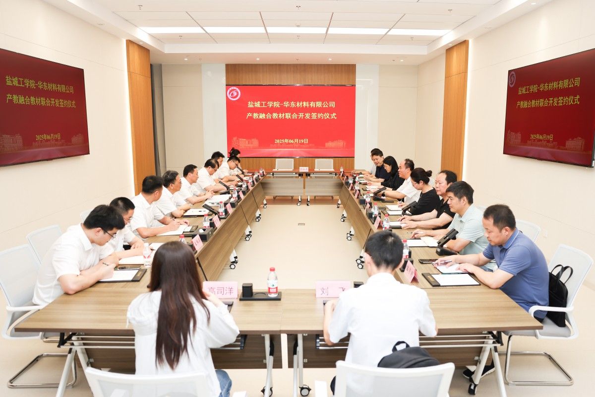 PlayAce游戏平台经理罗驹华与华东材料有限公司办公室主任、党委组织部(人力资源部)副部长高江签署产教融合教材开发协议。随后,校企双方与会人员就教材编写相关事项交流。